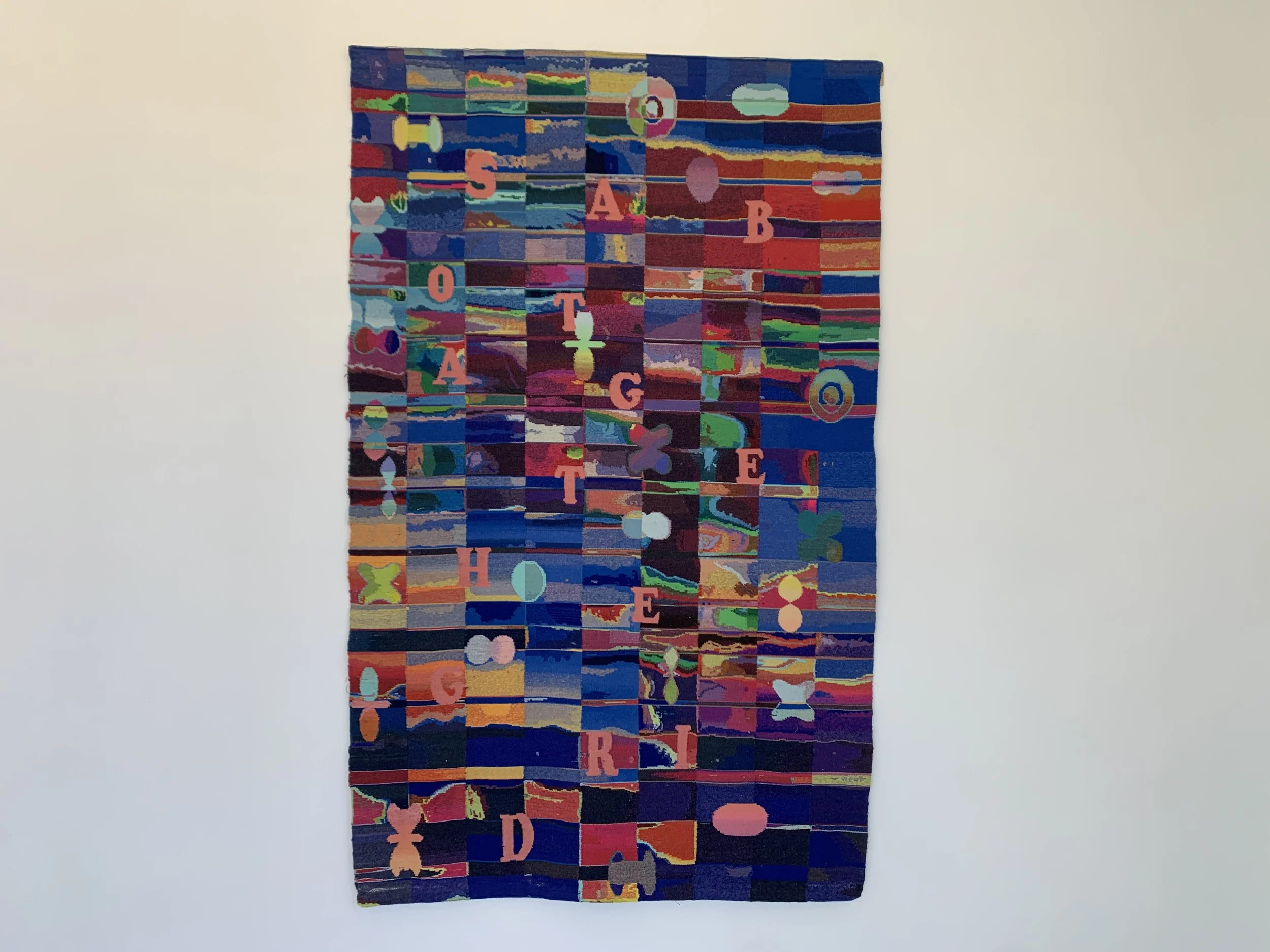 Pairing early internet visuals with the traditional, very bodily, craft of hand-weaving creates a fun disorientation. “Sabotage the Grid,” made in 1988, stands out in this aesthetic. Its roughly nine-by-twenty dark blue grid is criss-crossed with vibrant cellular-looking shapes—circles, chromosomes and the high-school-biology diagram of mitosis—along with poofy pink letters that spell the artwork’s name. The deep blue background and hot desert accents are reminiscent of a time when the internet still had a feeling of expansiveness.