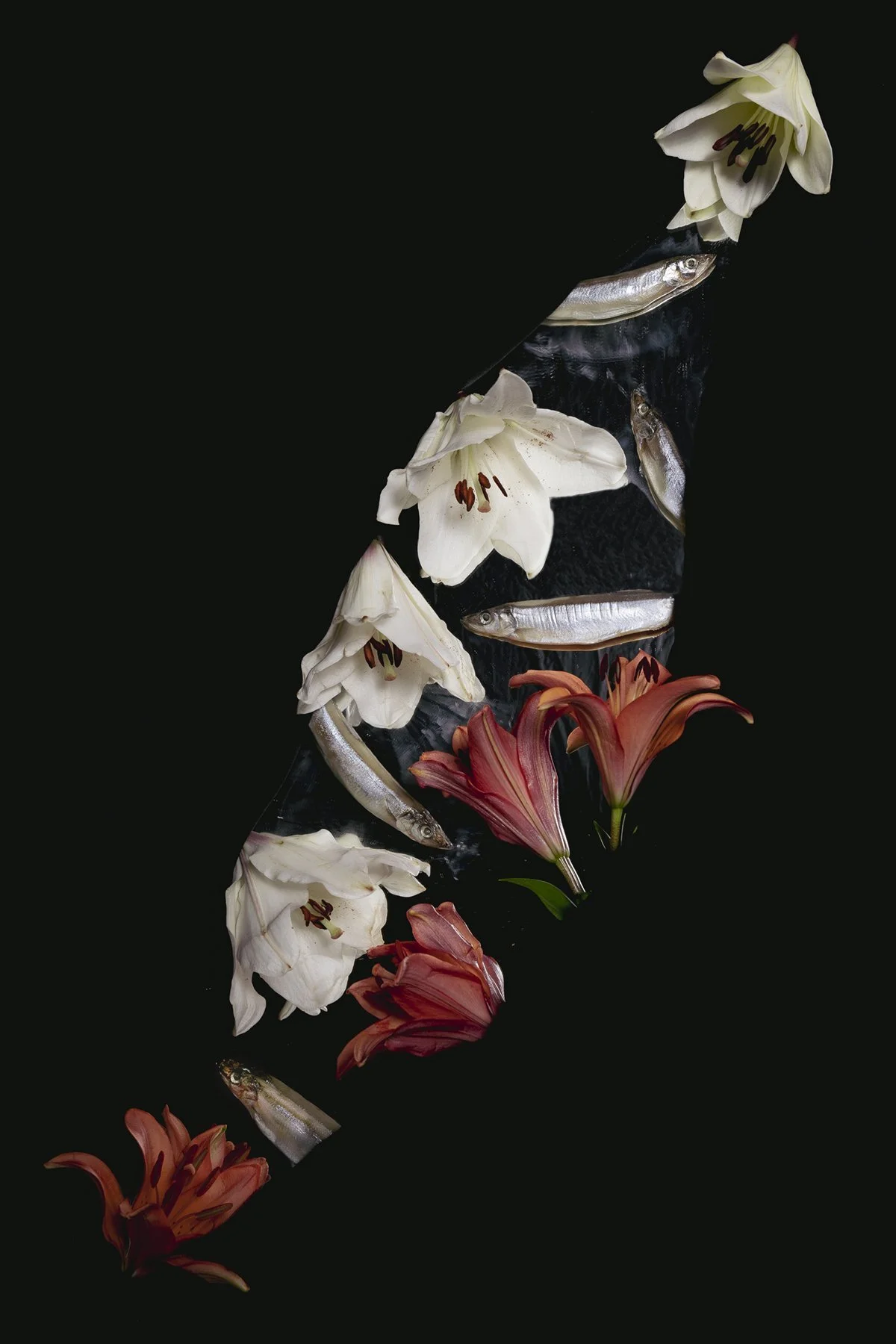 One print that does this particularly well is Octopus Arrangement (2019). “Arrangement” seems the right word here—the image is too sparse for a collage, and more asymmetrical than a pattern. Bite-sized octopuses and violets fill and exit the frame. Unlike many of his other photographs which adhere closer to a still-life setup, Octopus has no center.